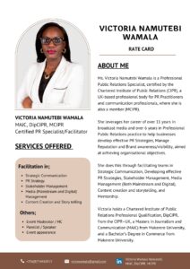 She’s a professional Public Relations Specialist, certified by the Chartered Institutes of Public Relations (CIPR). More about her is in the rate card.